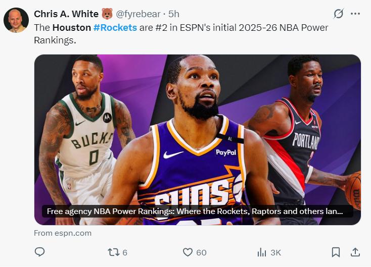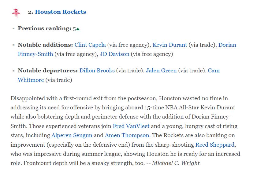 ESPN的评语:实力榜从第五升至第二。季后赛首轮出局后火箭没有浪费太多时间,他们立马引进了15届全明星杜兰特,同时签下了芬尼史密斯加强外线防守与外线投射能力,续约了范弗利特等多位老将;火箭还有像申京、阿门这样的后起之秀,谢泼德也被寄予厚望,这支火箭前场的深度十分出色。