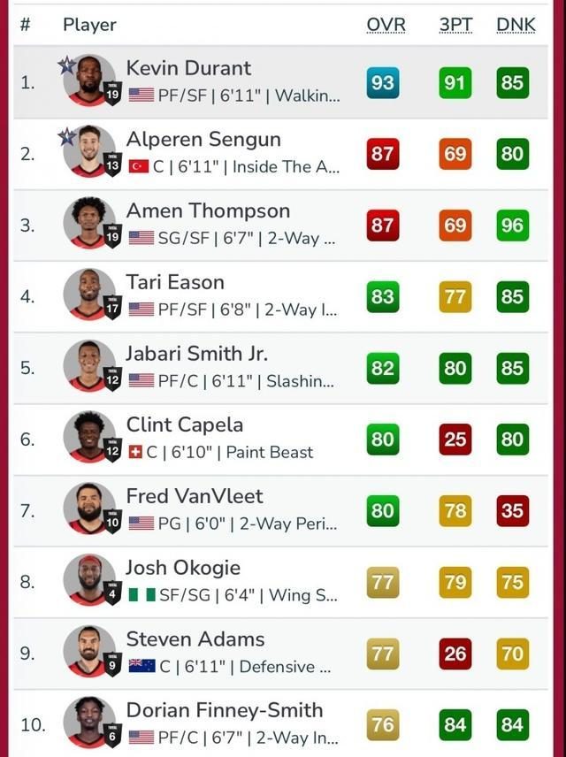 此前2K26游戏路透了火箭队多位球员的能力值:杜兰特93、阿门87、申京87,火箭全队有7人的2K能力值在80点以上,火箭队的阵容深度相当出色。